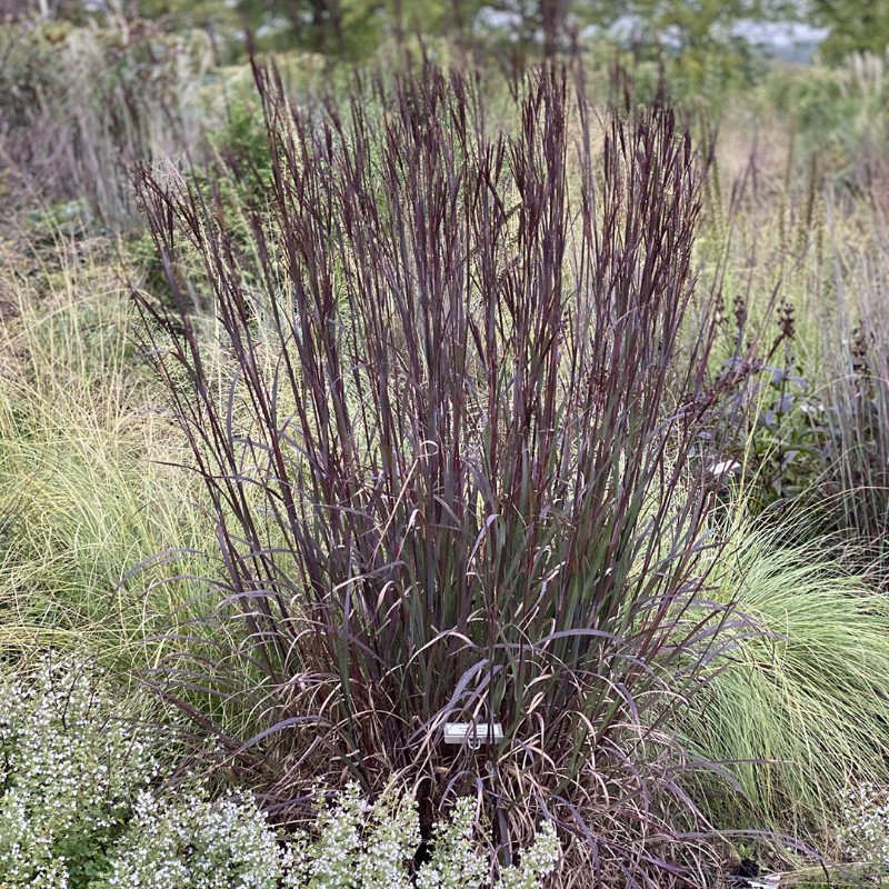 A majestic grass that shifts from green and purple to black, with flower spikes rising above its foliage.