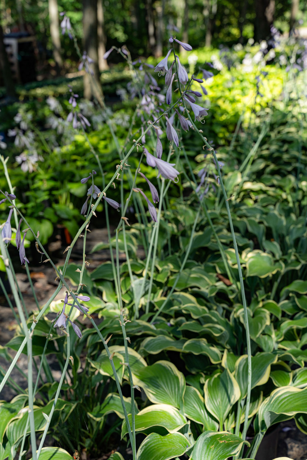 Wavy silver-blue foliage with cream edging and fragrant lavender flowers, perfect in partial shade and resistant to slugs.