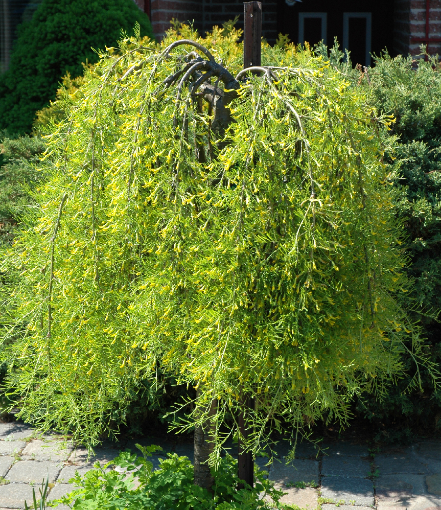 A rustic shrub with a weeping habit, with green leaves in summer and yellow in autumn, ideal for small gardens.