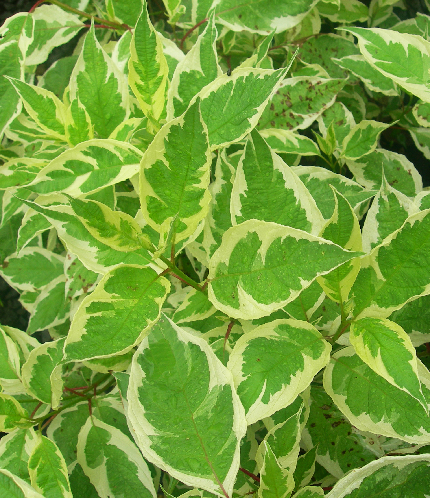 Arbuste compact au feuillage panaché vert et blanc et aux tiges rouges, idéal pour sols humides et bien drainés.
