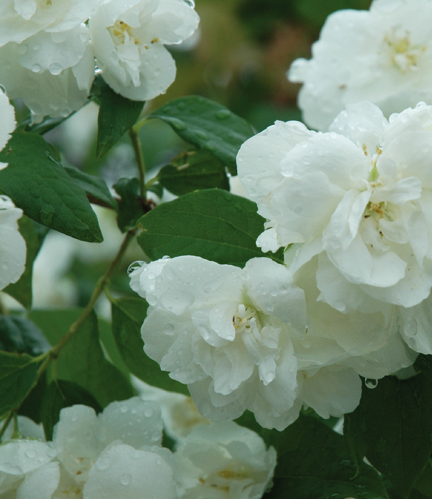 Arbuste vigoureux aux fleurs doubles blanches et très parfumées, idéal pour haies ou arrière-plan, floraison en juin.