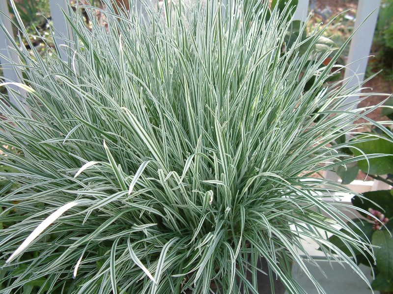 Petite graminée panachée au feuillage vert et blanc, au port retombant et à croissance rapide, tolérant la sécheresse.