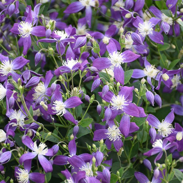Cette clématite hybride offre une profusion de fleurs étoilées bleu-violet avec des anthères blanc crème, de juin à septembre.