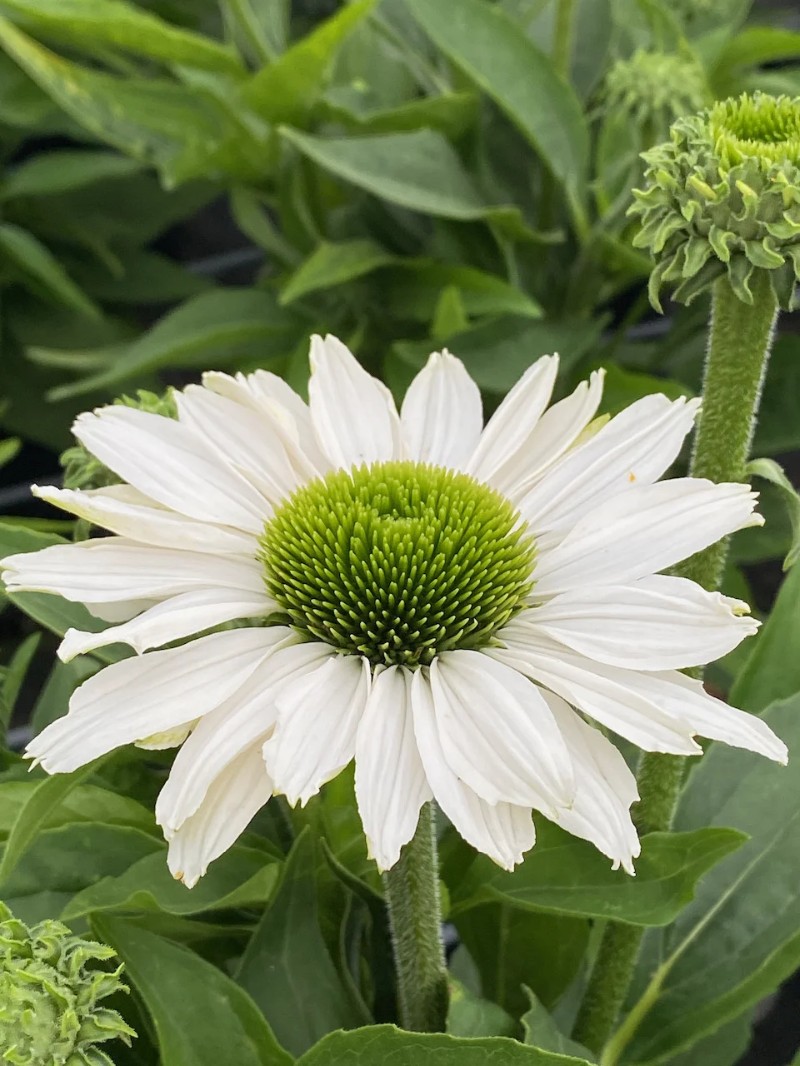 Plante compacte à fleurs blanches et cône jaune-vert, idéale pour attirer abeilles et papillons de juillet à septembre.