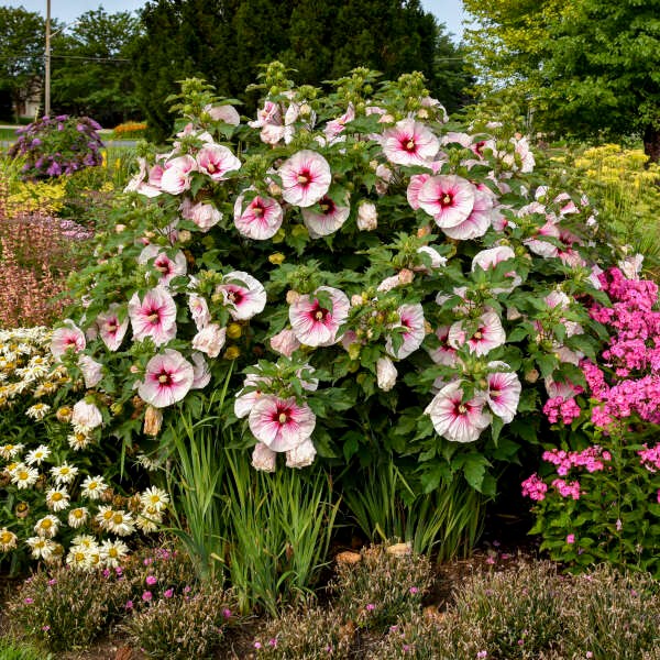 Découvrez une vivace spectaculaire avec des fleurs blanches à cœur rouge framboise, idéale pour attirer abeilles et colibris.