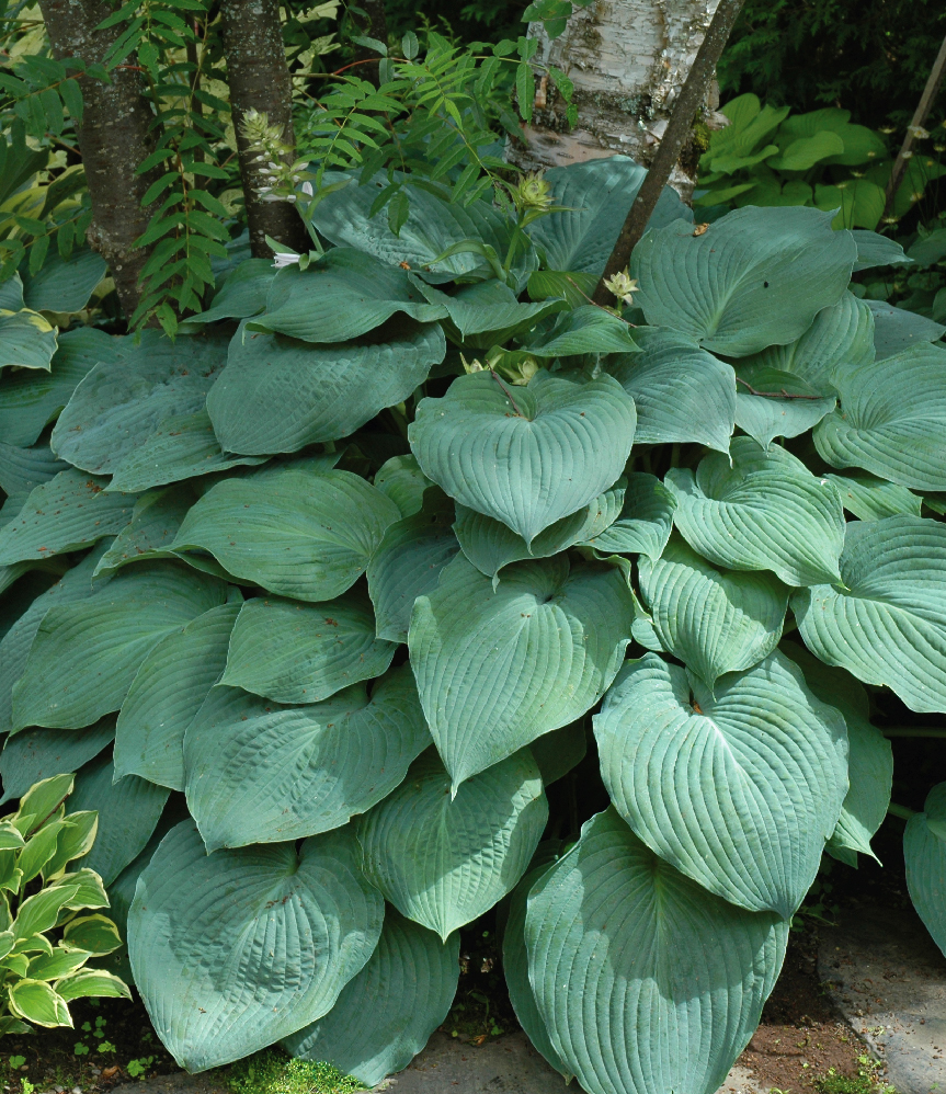 Feuillage bleu spectaculaire et fleurs blanches délicates, parfaites pour les zones mi-ombre à ombre. Hauteur de 90 cm.